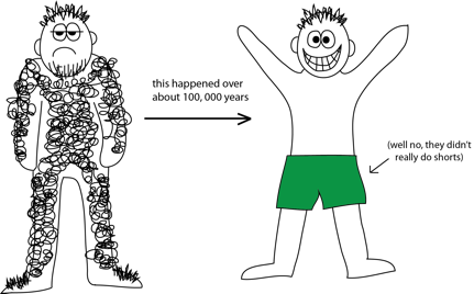 The story begins in Africa, about two million years ago, when early members of the genus Homo began moving from the cool cover of forests onto sunnier open plains to find food. These early humans were densely covered in hair, which increased their body temperatures and made them slower hunters.