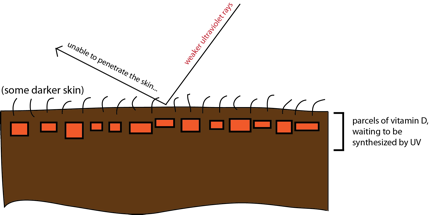 Vitamin D is made naturally in the body when UV in sunlight hits the skin. Just like folate, it is vital for reproduction. But because humans had developed higher melanin levels to protect them from the tropical sun, they left Africa with a powerful melanin buffer that dangerously shut out the delivery of Vitamin D-producing UV.