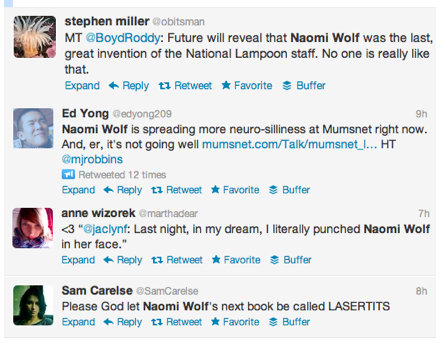 Helen Lewis’s New Statesman review calls Wolf’s new book, “unblushing in its anatomical precision and unashamed in gesturing to all manner of mystic woo-woo about the froo froo.” The severe review in The New Yorker, by Ariel Levy, says, “Wolf has found a mistress we must please, serve, and honor. There is a new dominatrix in town. And her name is Vagina.” Tim Skellet , contributor to The Guardian, blogged that “Vagina” is “full of neurobollocks, the incorrect and inappropriate use of neuropsychology in fake explanations.”