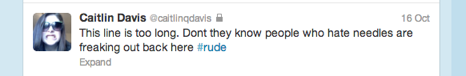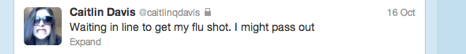 (And in case you’re wondering, I was too busy running far, far away from the needle-filled Health Center to remember to tweet after I got my shot.)