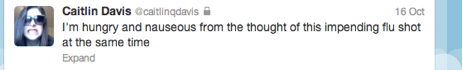 (And in case you’re wondering, I was too busy running far, far away from the needle-filled Health Center to remember to tweet after I got my shot.)