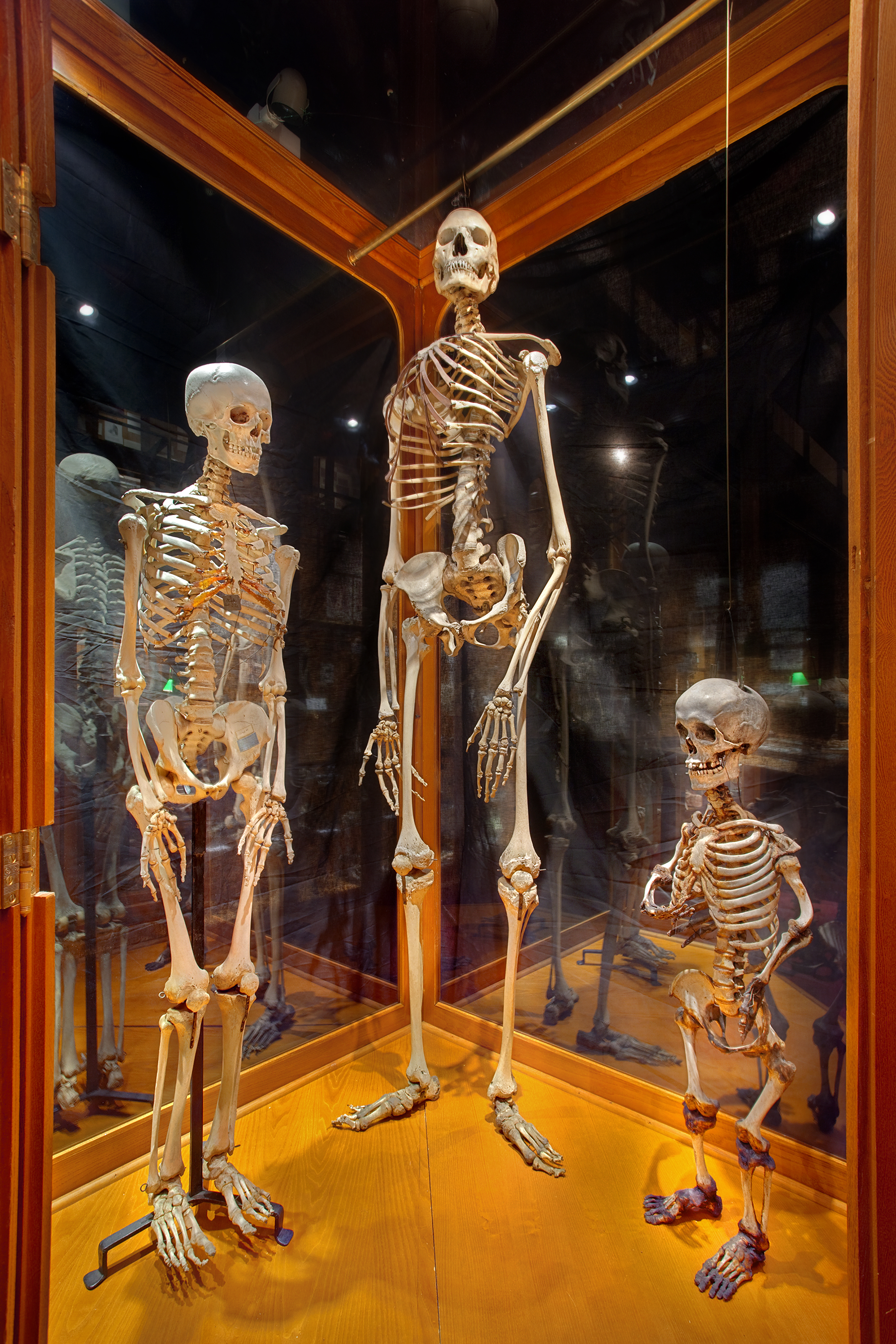 Skeletons of an average sized male, a 7'6" giant, and a 3'6" dwarf [Image credit: © 2009 George Widman Photography LLC, Licensed for use by the Mutter Museum of The College of Physicians of Philadelphia]