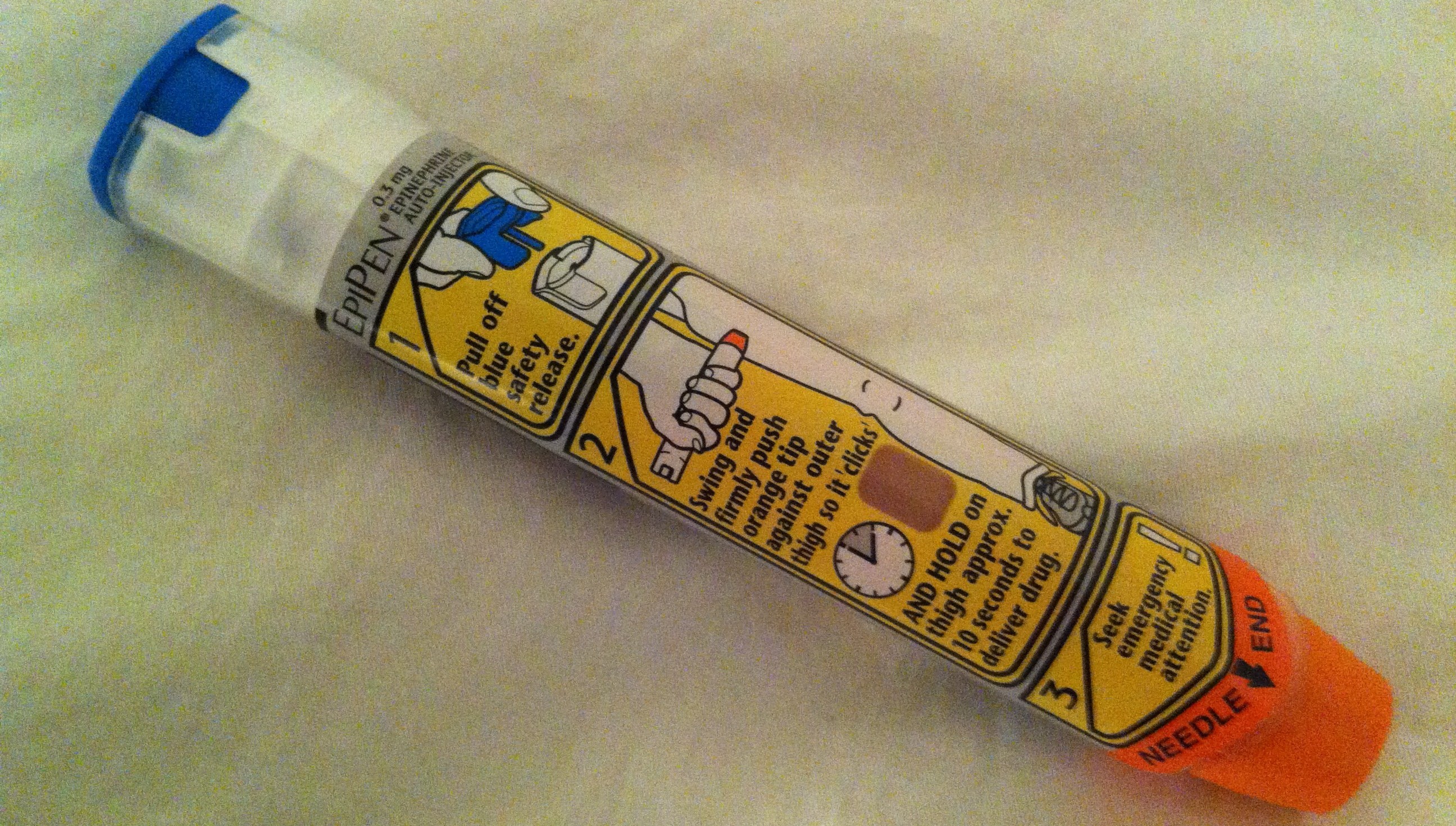 An EpiPen is a tubular, hand-held injection device (roughly the size of a tube of toothpaste) filled with the hormone epinephrine. When you correctly administer an EpiPen, you actually inject a small dose of epinephrine into the bloodstream by forcibly releasing the hormone through a needle into your upper thigh. When you press the tip of the EpiPen against your thigh to release the medication inside, it makes a clicking noise, like pressing the top of a retractable pen. The tip of this pen just happens to have a needle in it.