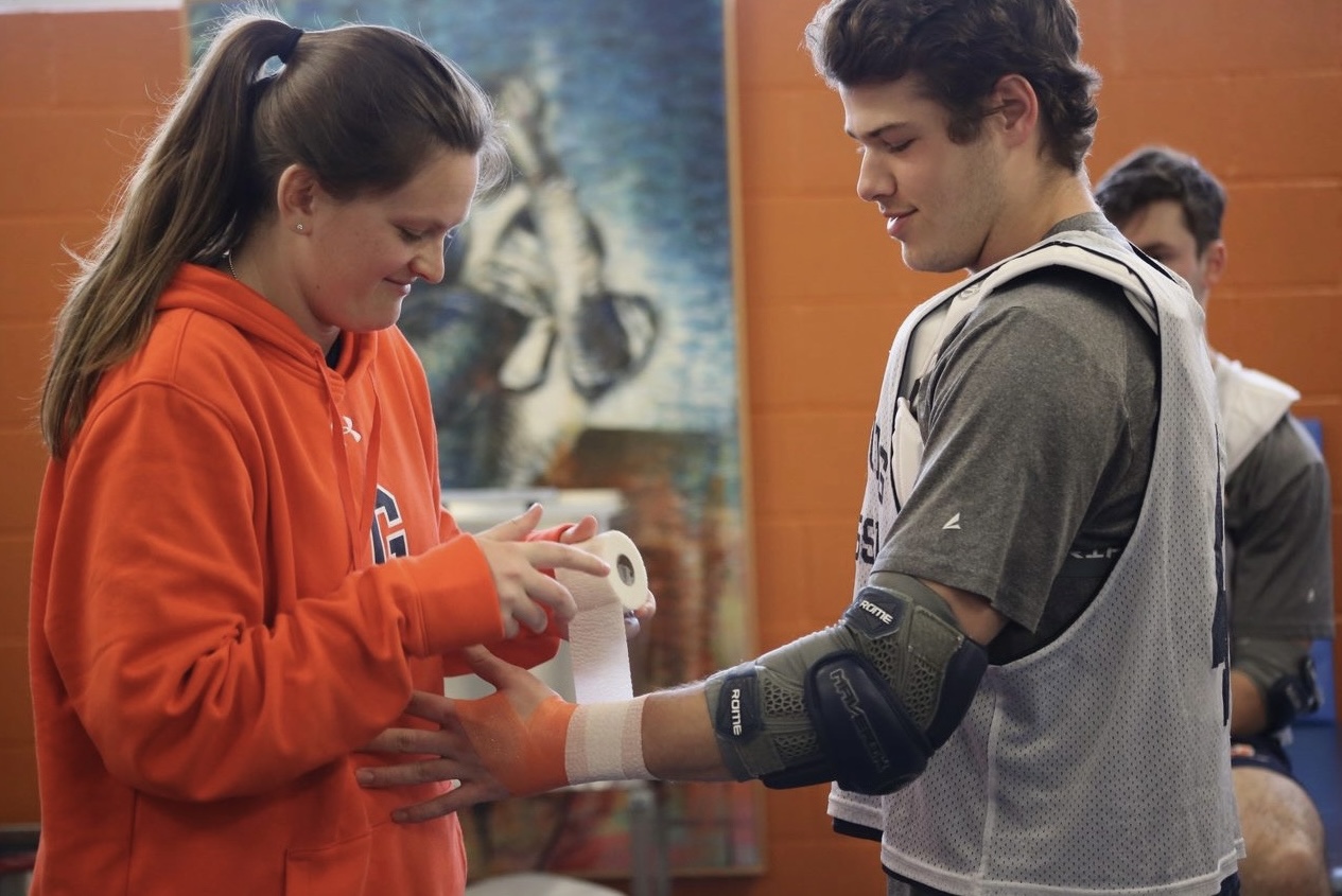 Athletic trainer Lauren Fry taping a wrist at Gettysburg College in March 2022. [Credit: Lauren Fry]